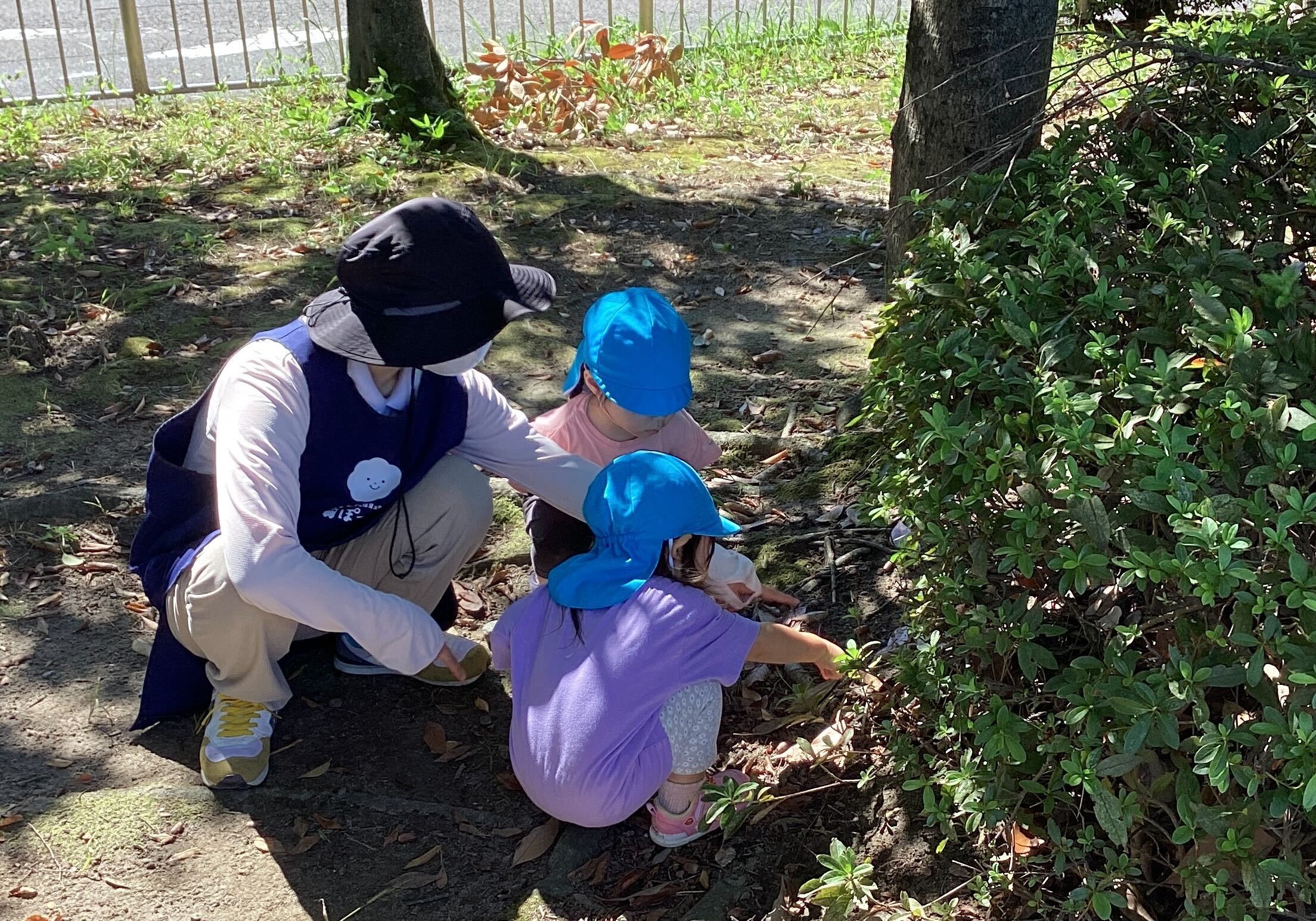 しゃがみこんで、葉っぱや木の下をのぞいて探します。