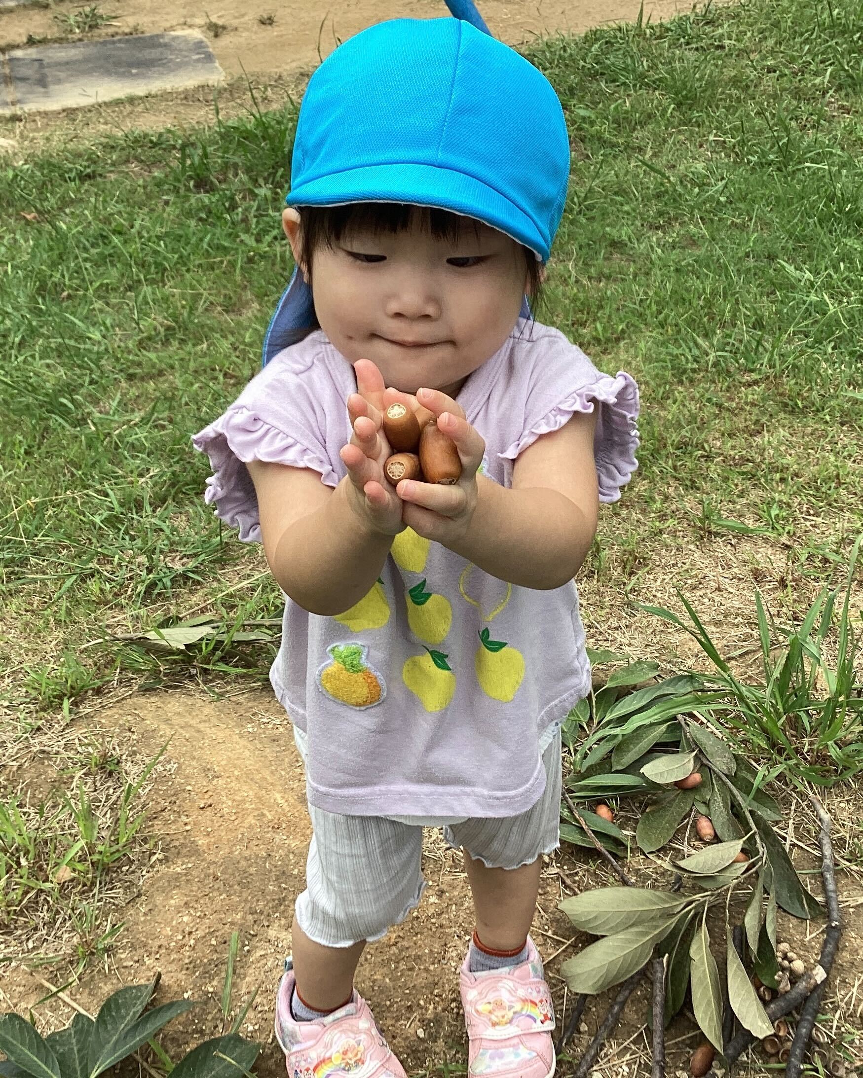 どんぐりを見つけると、両手いっぱいに拾うお子さまたち。