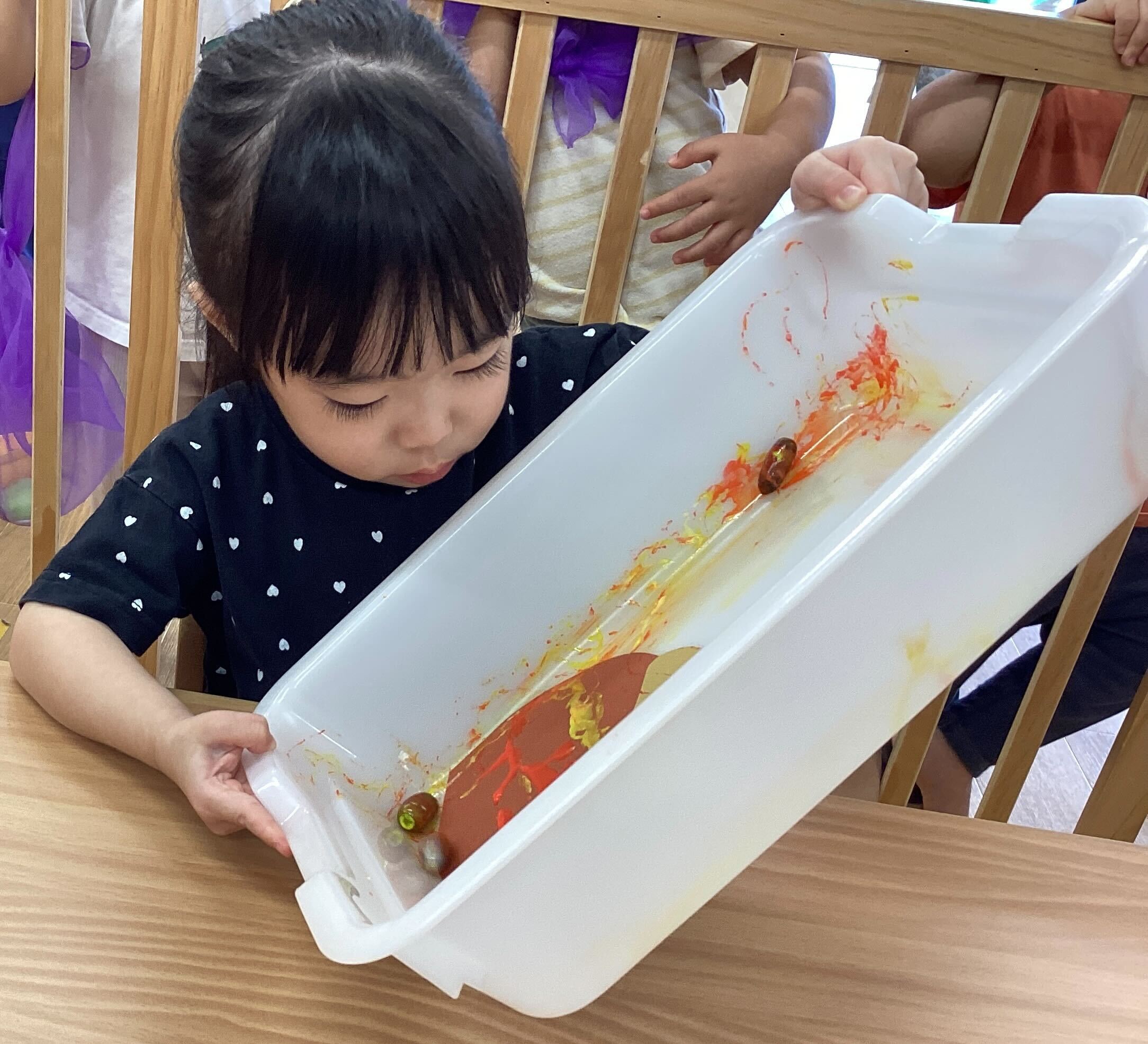 拾ってきたどんぐりに絵の具をつけて、コロコロ。