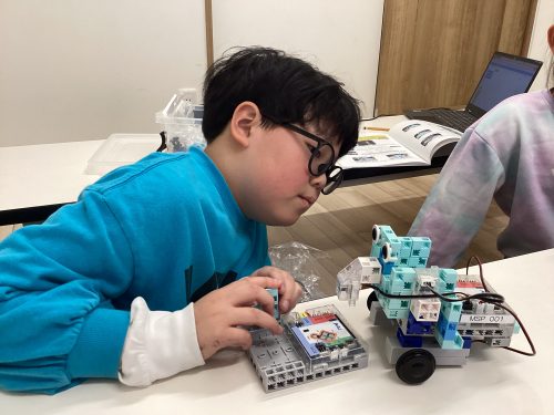 1stクラスでは複数のセンサーをつかって「茶運びロボット」のプログラミングに挑戦しました。
