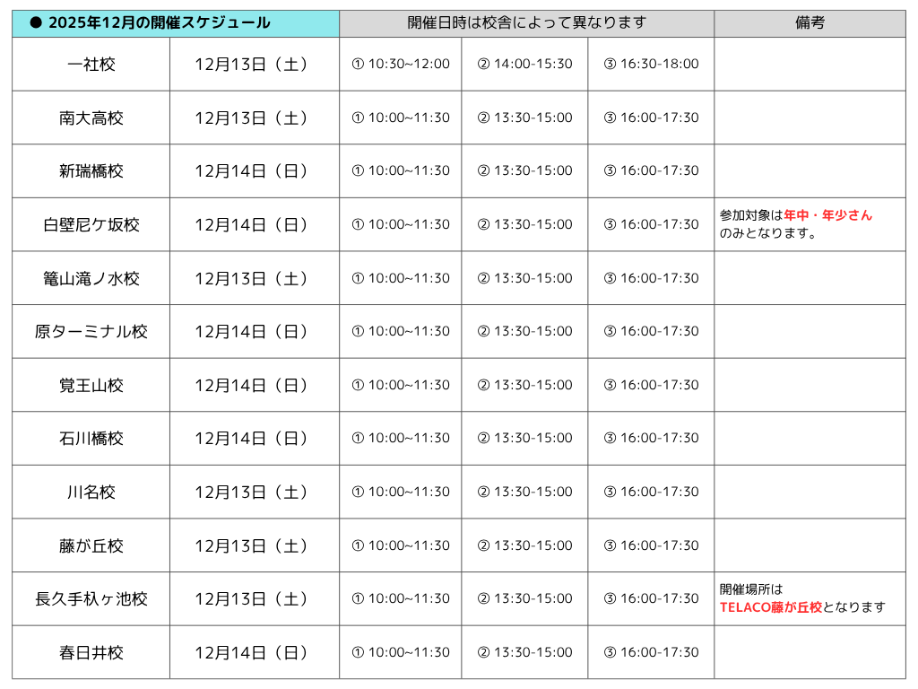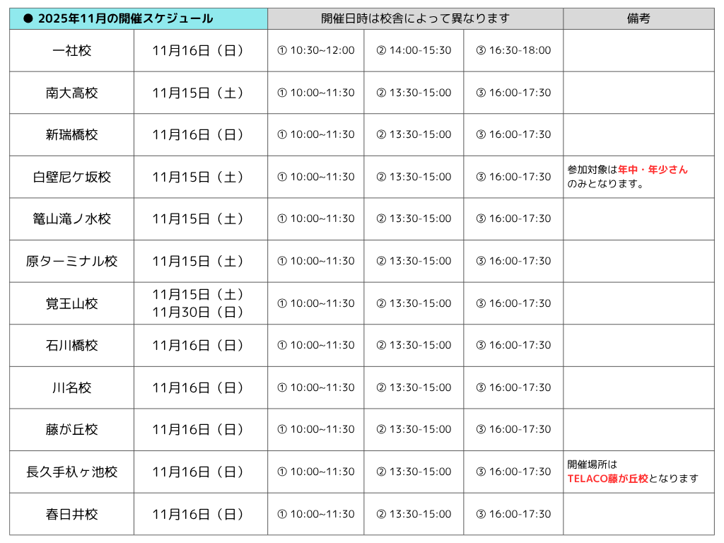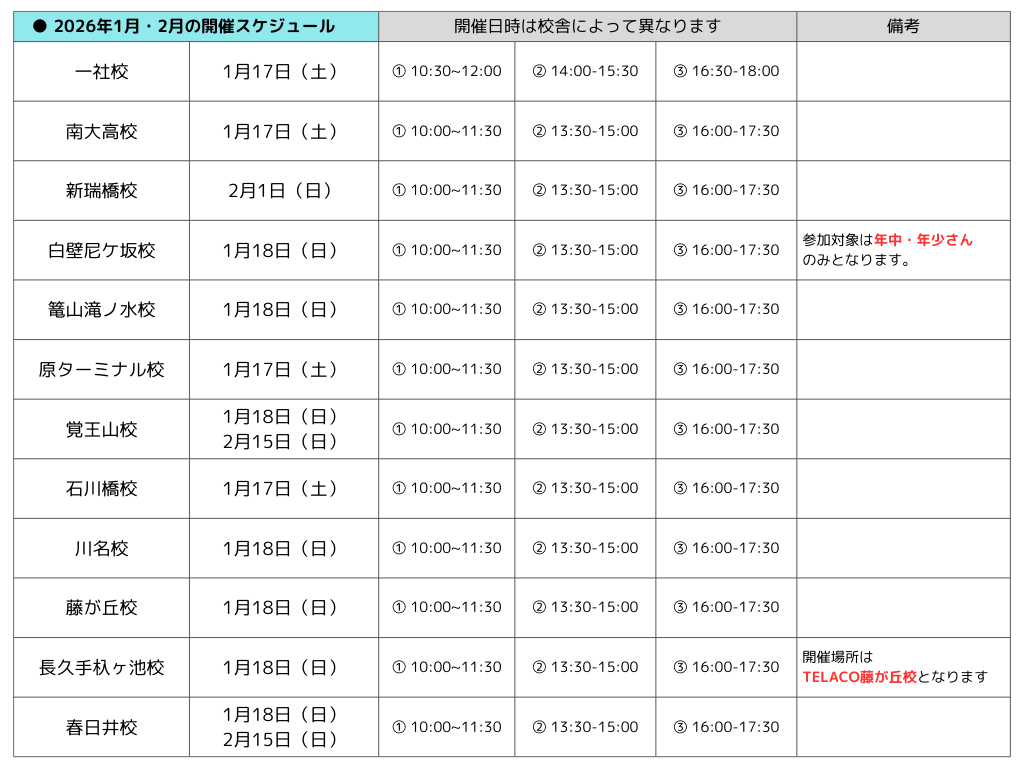 ※白壁尼ケ坂校はTELACOキッズ入会(年中・年少さん)向けの体験会となります。